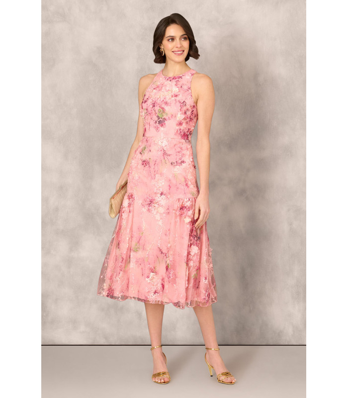 Sleeveless Embroidered Side Flounce Midi Dress In Pink Multi