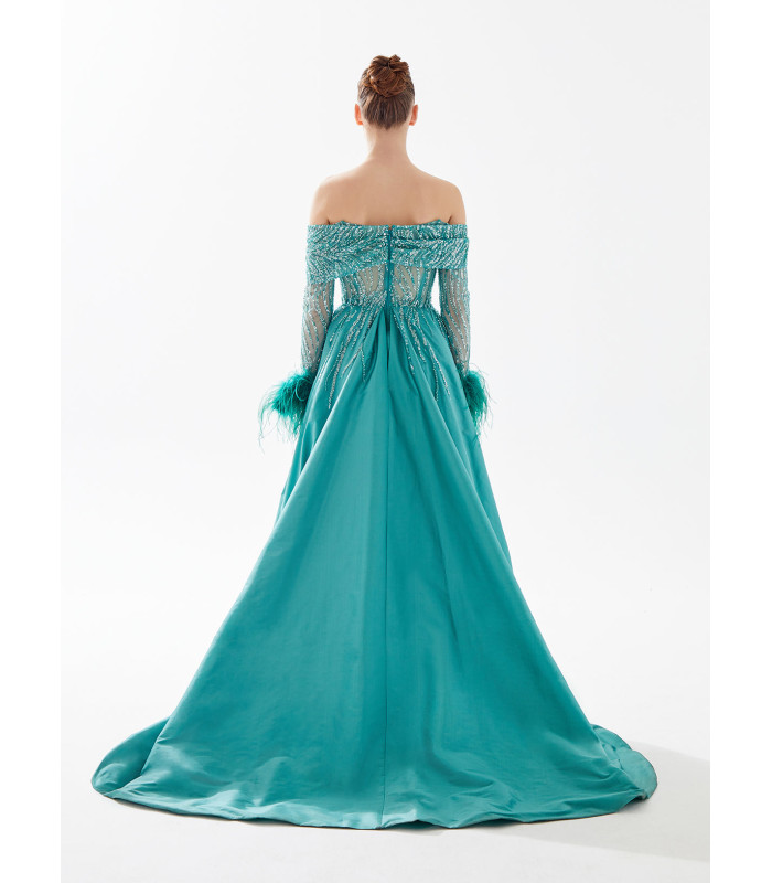 A-line dress with feather and sequin embellishments