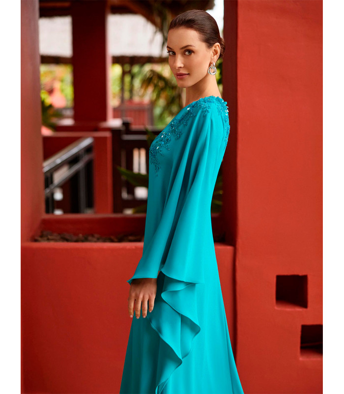Cyan crepe dress with flowing sleeves and rhinestones.
