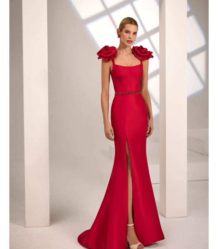 Mikado dress with flowers on both shoulders