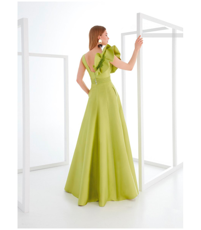 Dress with V-neck, open back and gathered ruffle at the shoulder