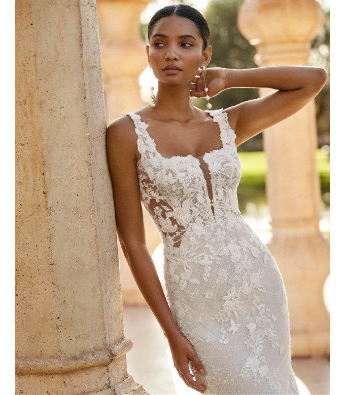 Mermaid-style lace dress with detachable sleeves