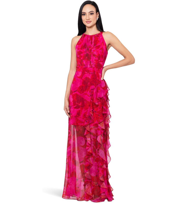 Vestido sin mangas con cuello halter y estampado floral con volantes en cascada y lazo en la espalda