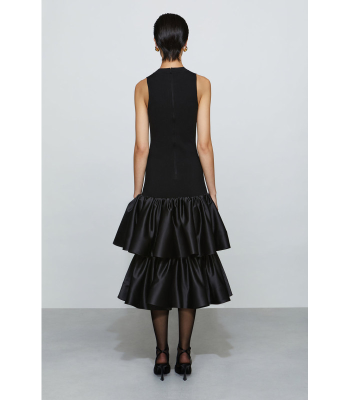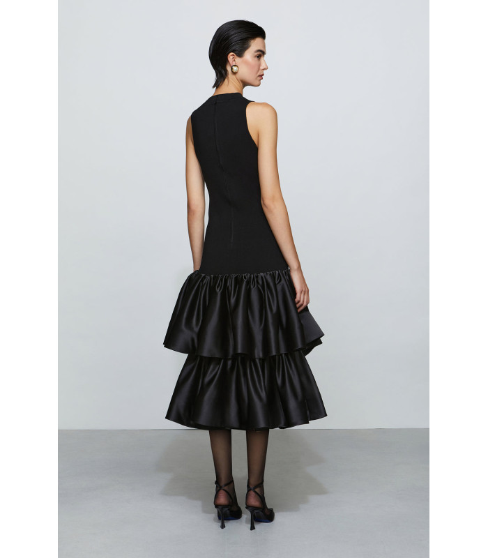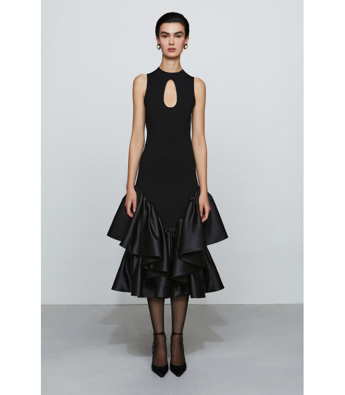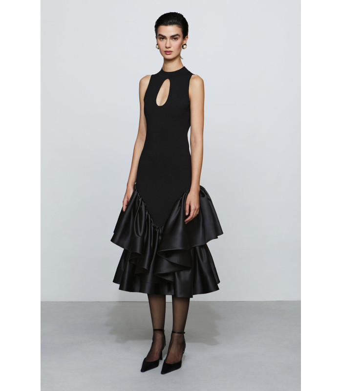 Vestido con abertura en forma de lágrima y volantes de satén