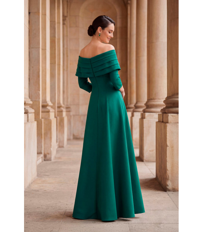 Vestido con hombros descubiertos y mangas tres cuartos, corte en A
