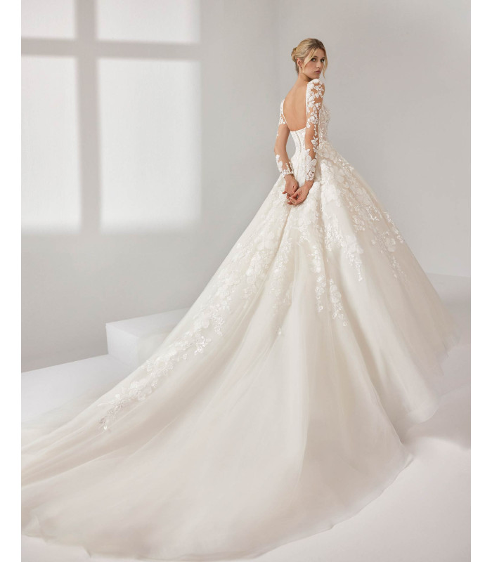 Vestido de encaje y pedrería, escote cuadrado, mangas desmontables y espalda abierta.
