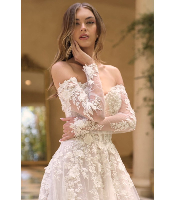 Escote corazón con hombros descubiertos, mangas transparentes y apliques de encaje floral en 3D
